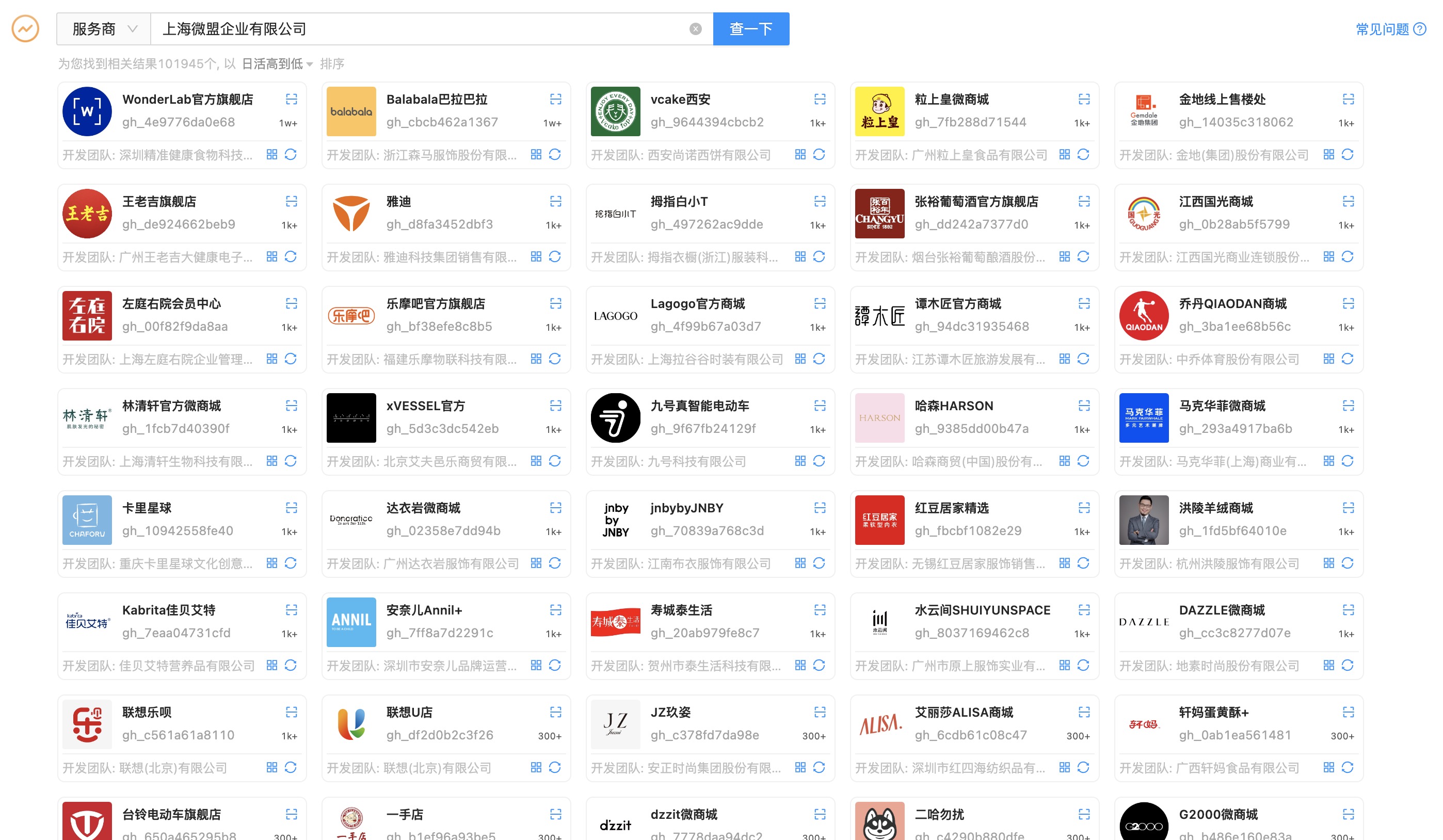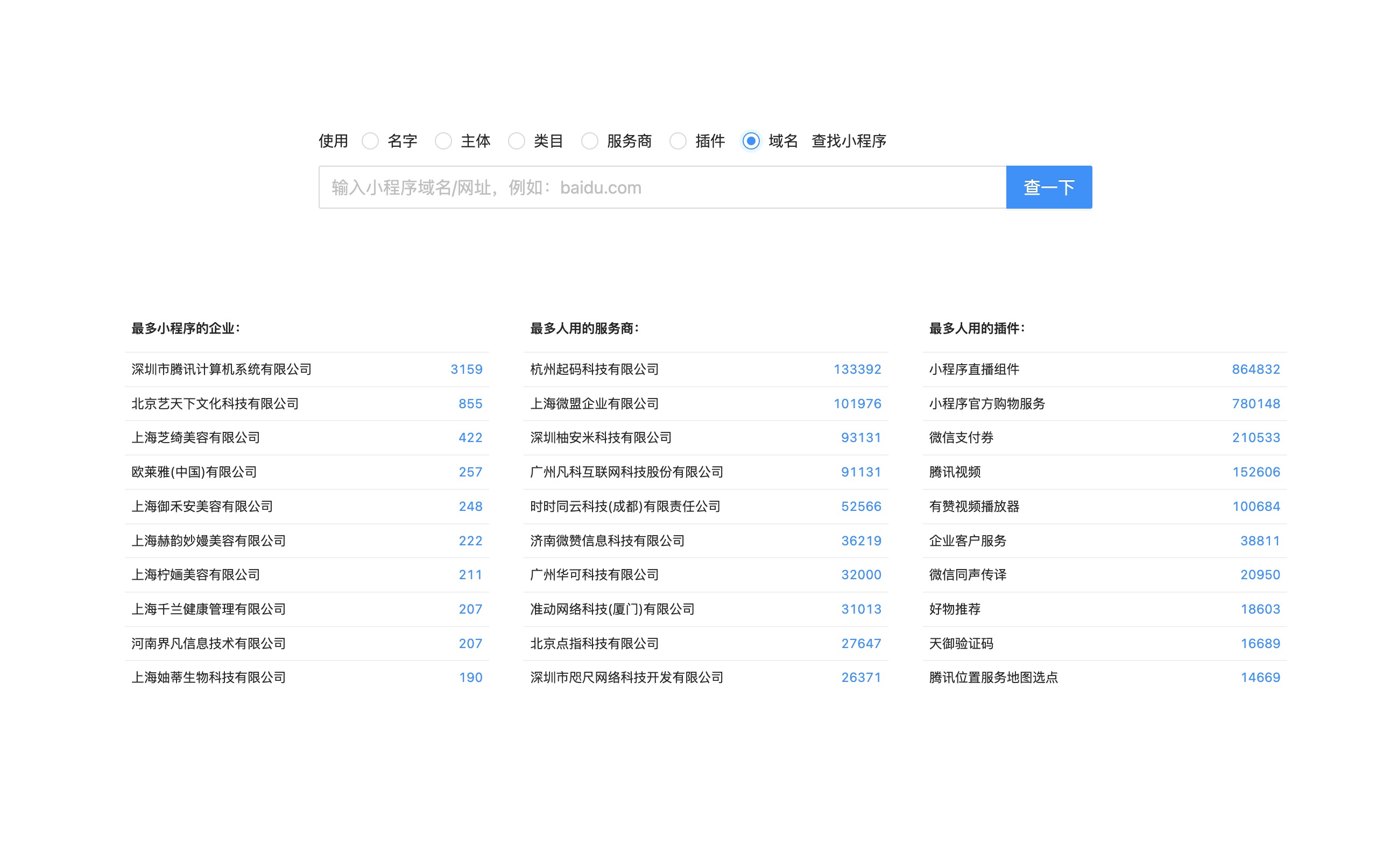 一个小程序数据平台,可以通过主体、域名、服务商等方式查询竞品数据。