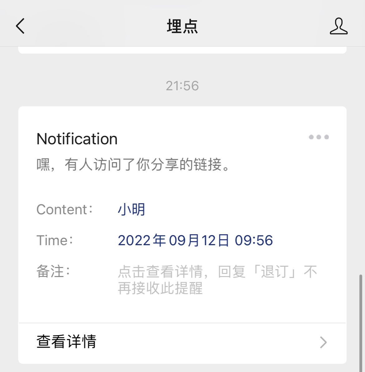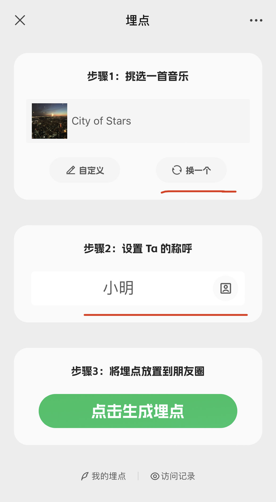 一个访客记录 H5 工具,生成一条音乐链接,分享到朋友圈后有人点击链接可以收到通知,最初产品思路是不需要点击 只要有人访问朋友圈就能记录,但因微信某些变动 导致无法实现。