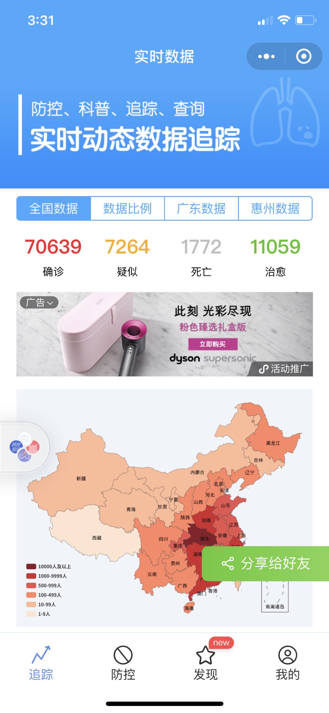一个疫情数据地图小程序,可以查看全国各地最新疫情数据,运行一段时间后因资质问题被关停。